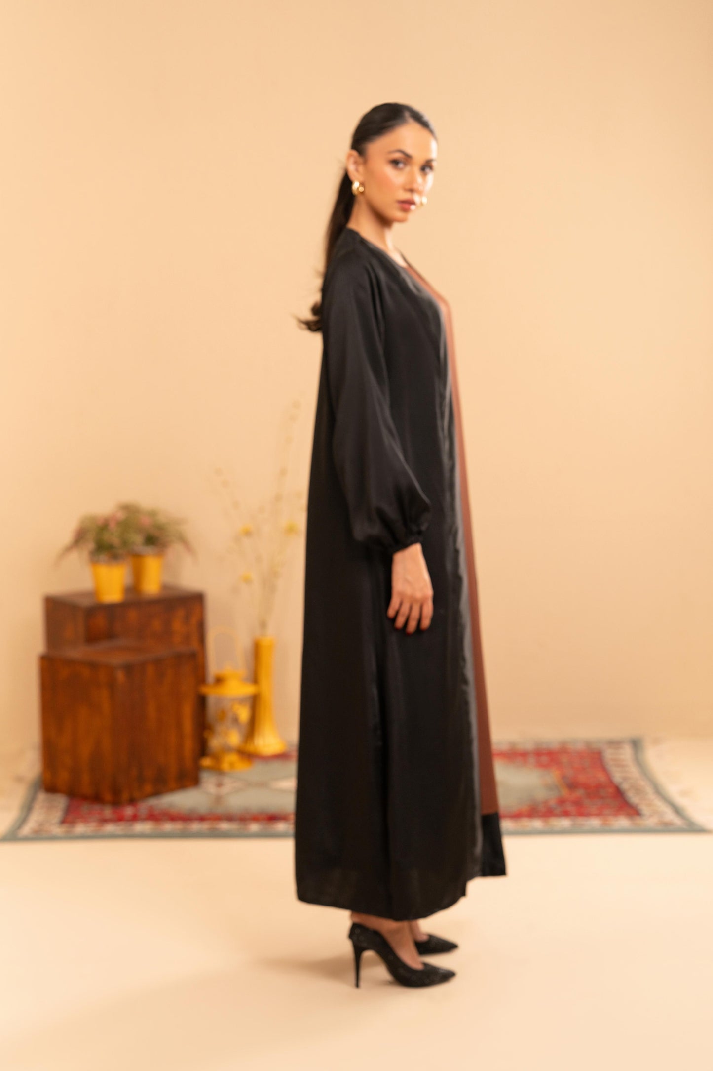 • Design: Open-front abaya with gathered sleeve cuffs