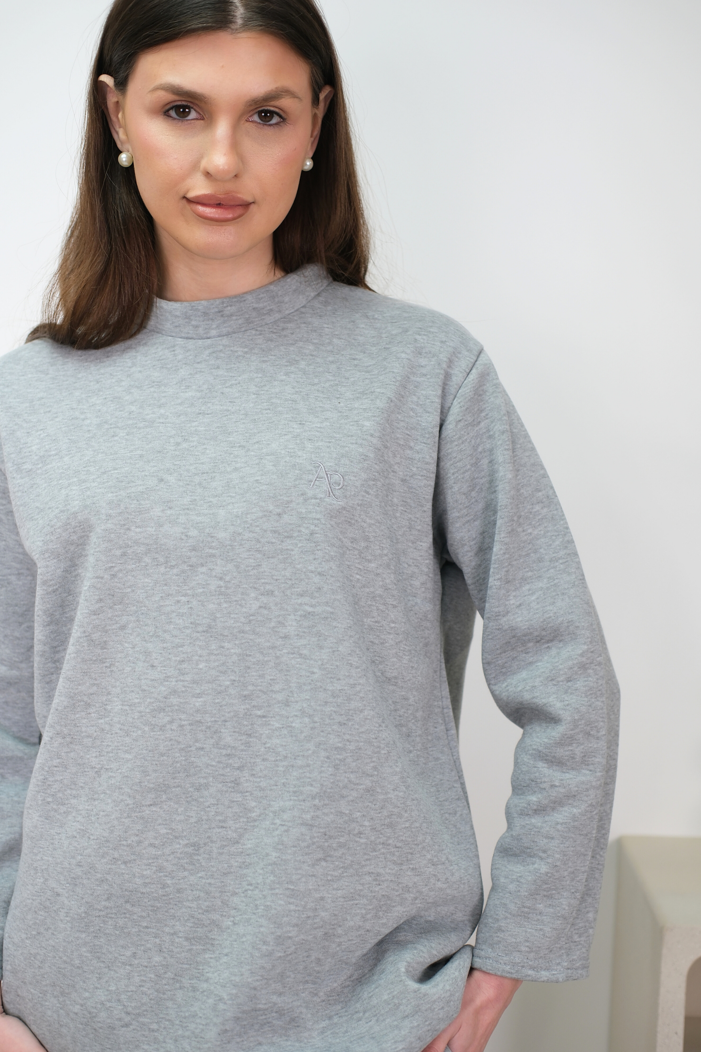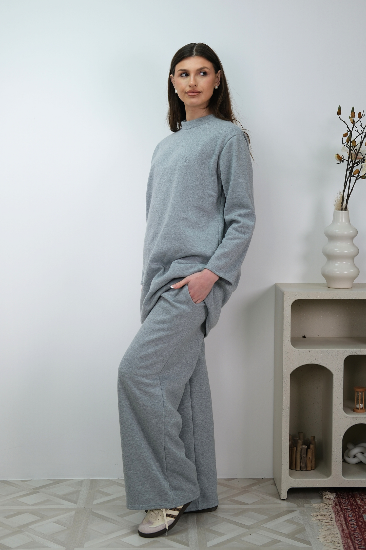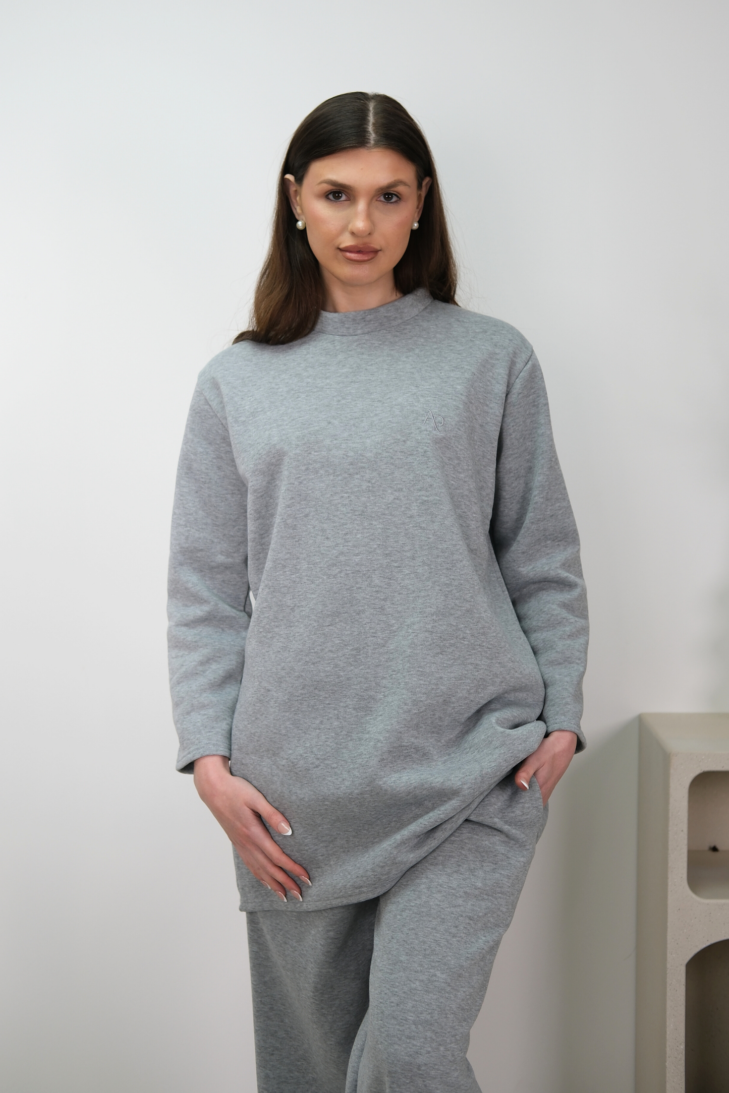 Relaxed co-ord set crafted from a smooth stretch blend. Designed with a clean high neckline and wide sleeves for a modern, modest silhouette. Finished with an exclusive AAPA’S embroidered logo on the chest. Paired with wide-leg trousers featuring side pockets for effortless structure and comfort.