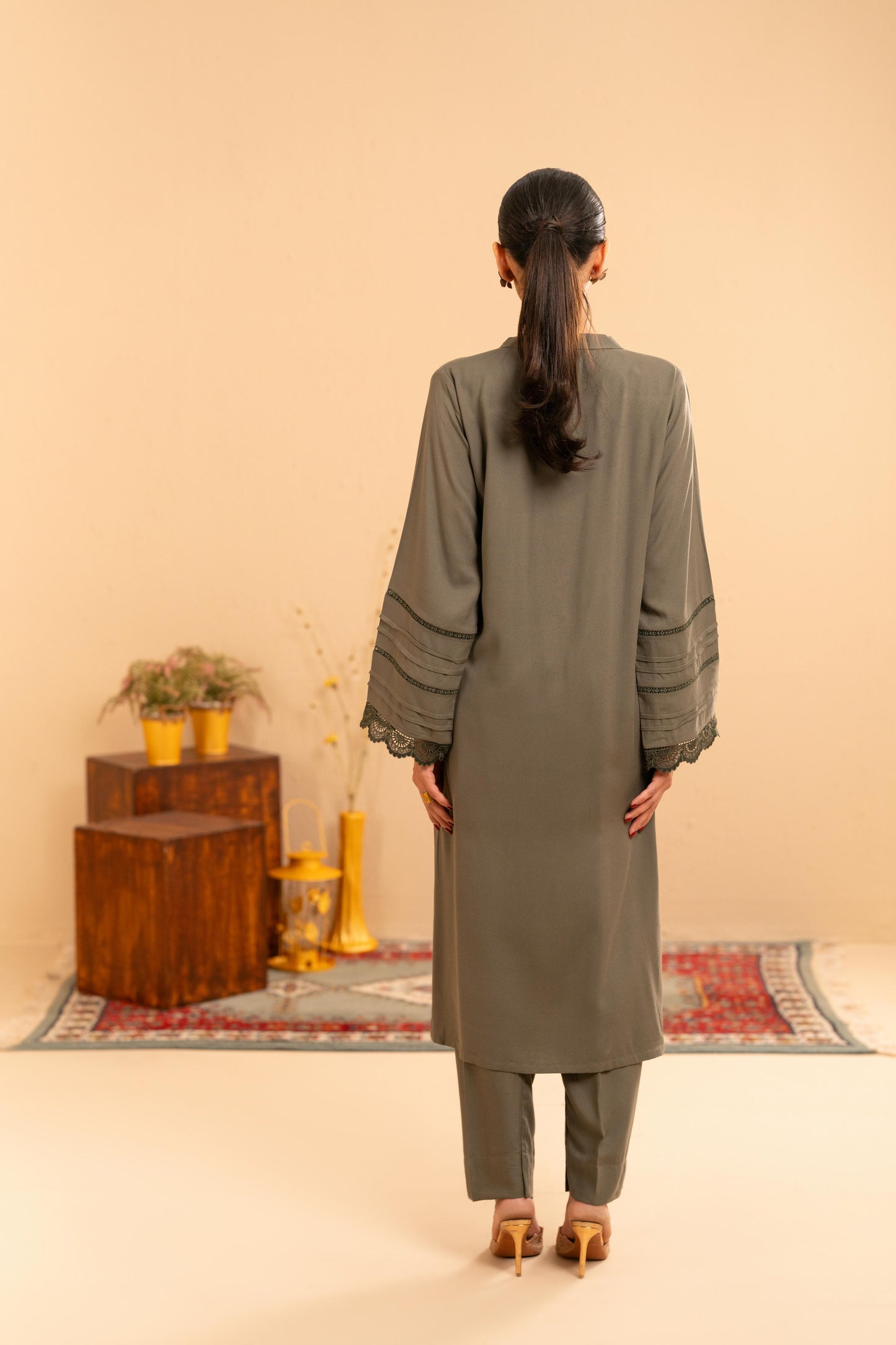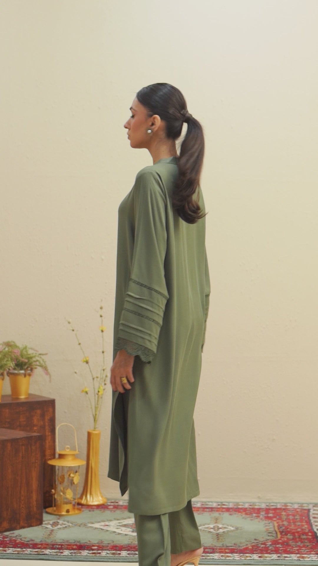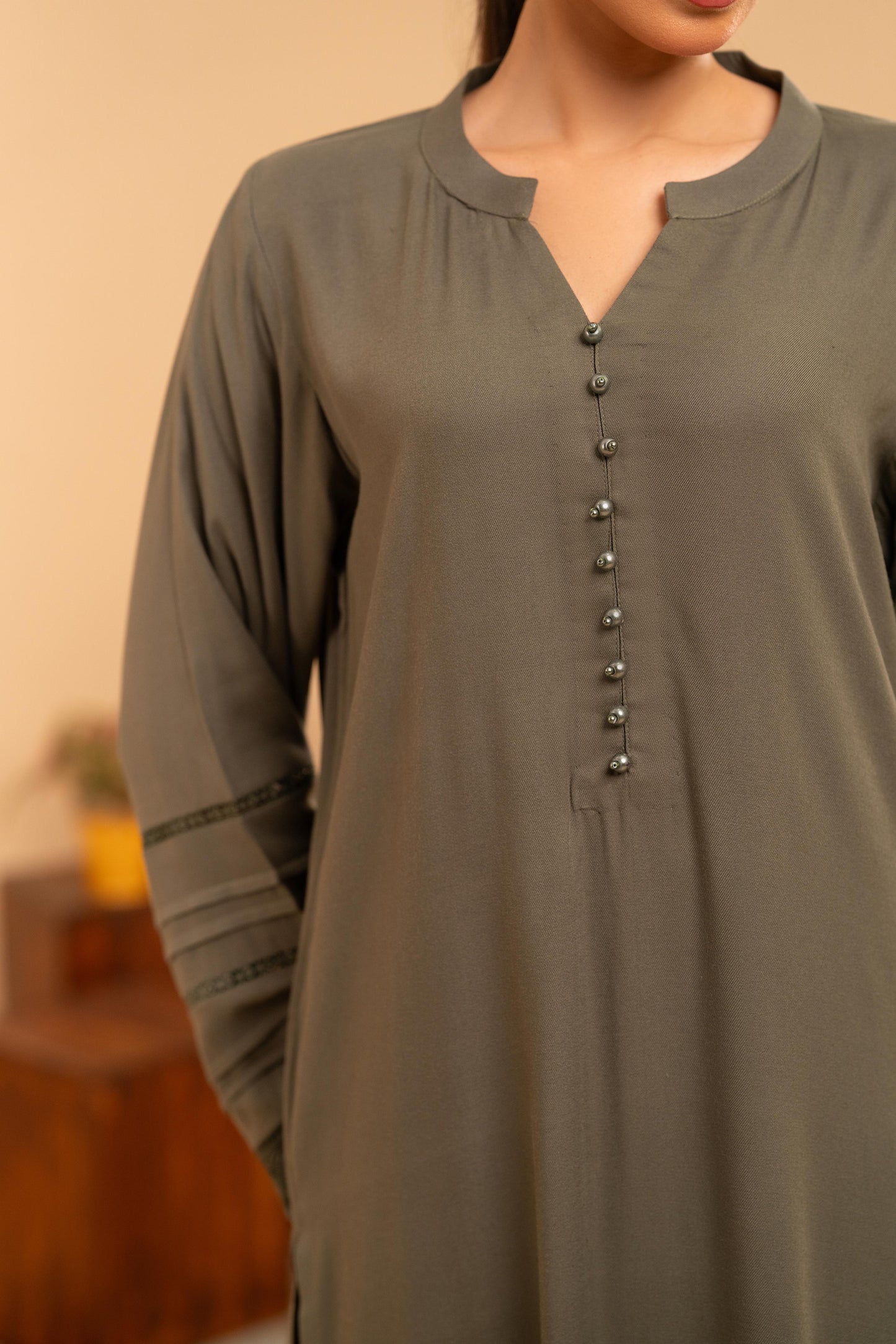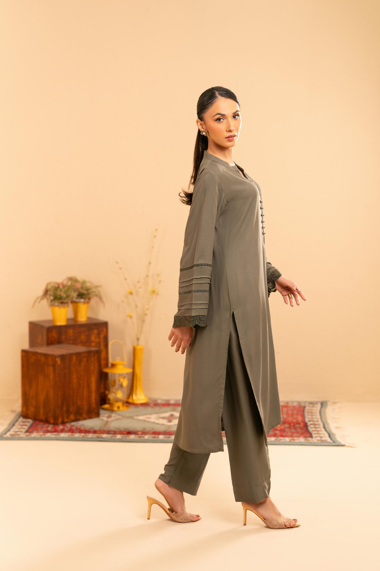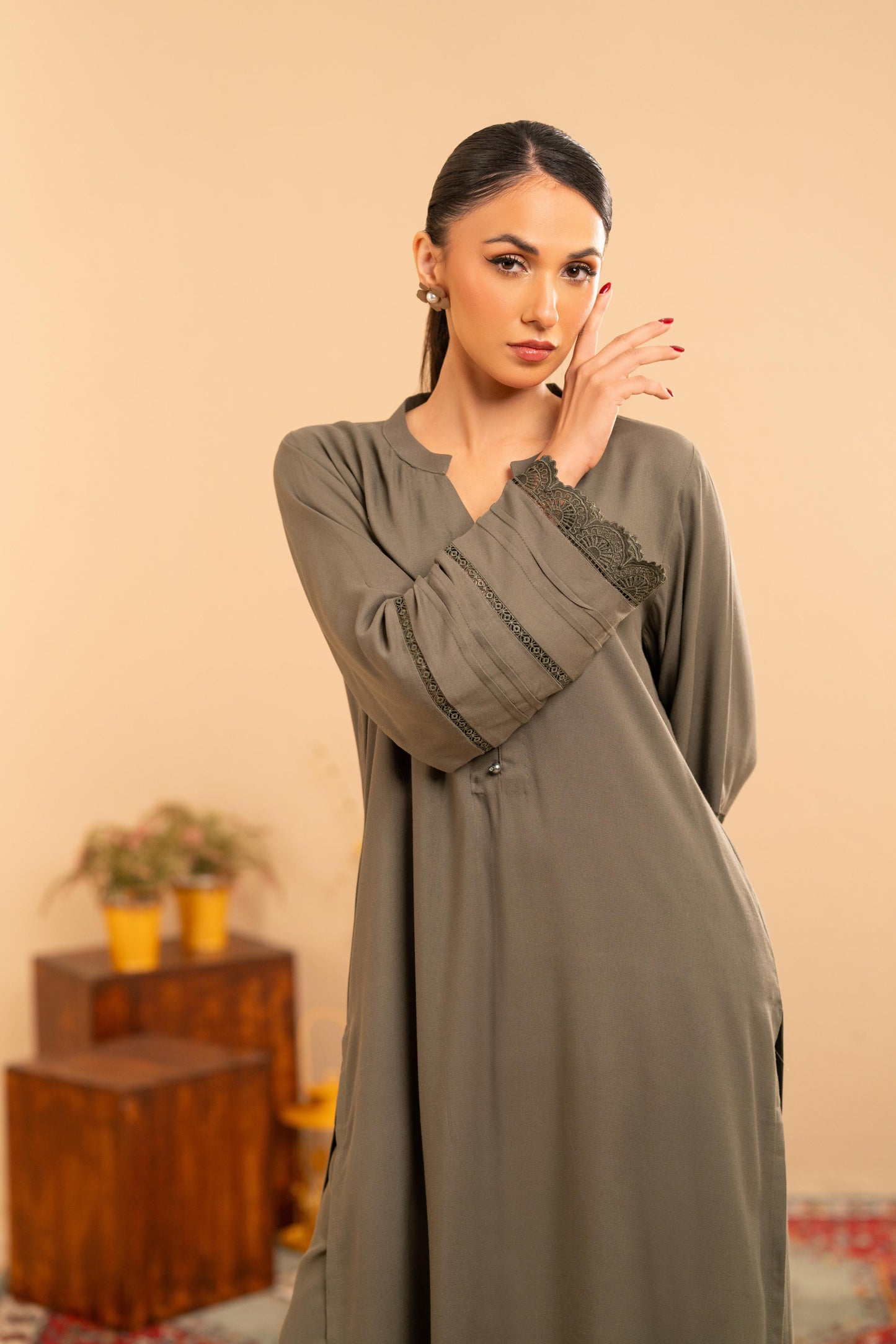 Designed for effortless sophistication, the Mareena Co-Ord Set is crafted from breathable viscose in a rich dark khaki tone. The 44” long top features a clean neckline with delicate button detailing, finished with subtle lace accents along the sleeves for a refined, feminine touch.