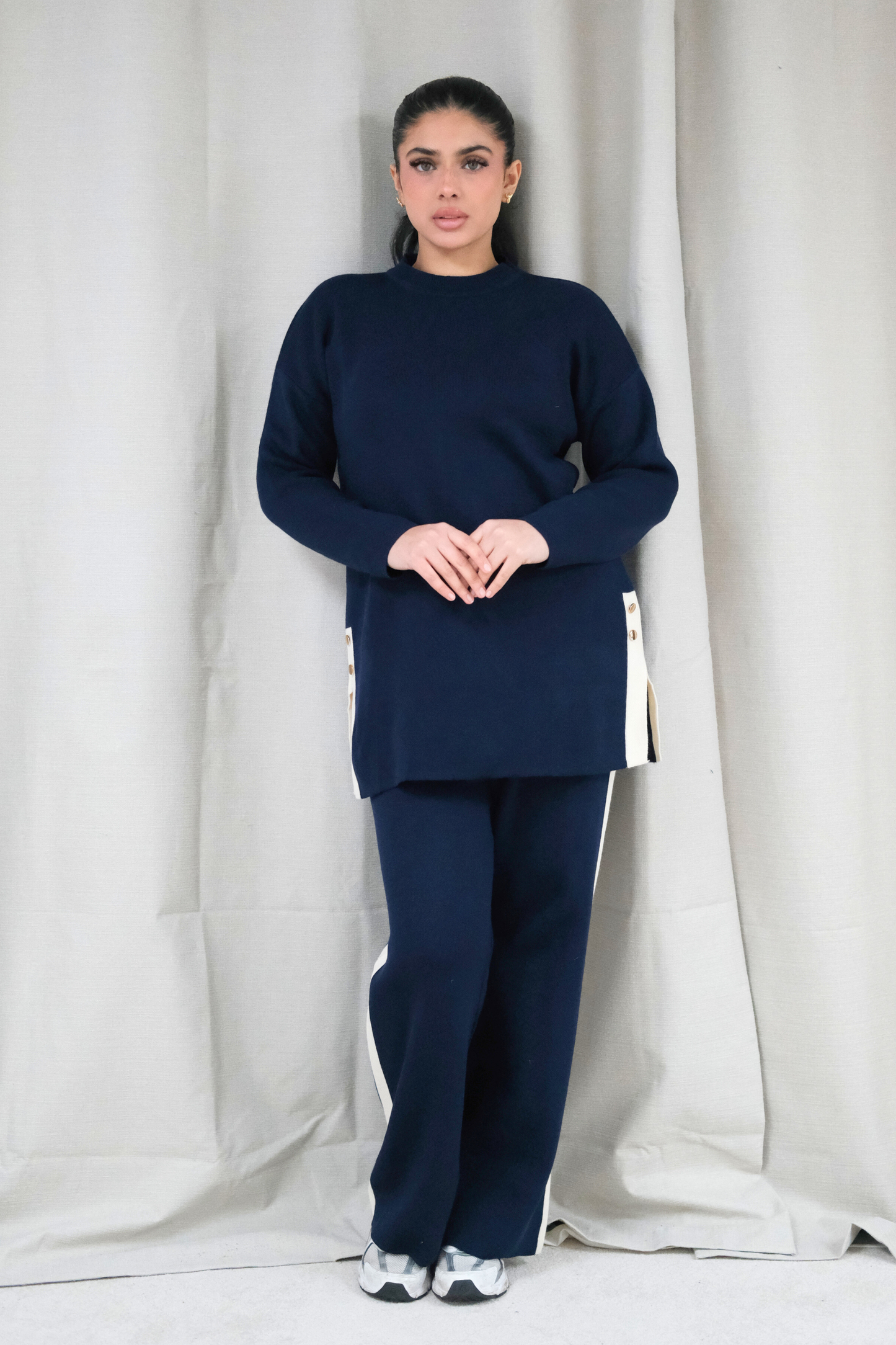 - Design: Relaxed knit top with side button detail & matching straight-leg trousers