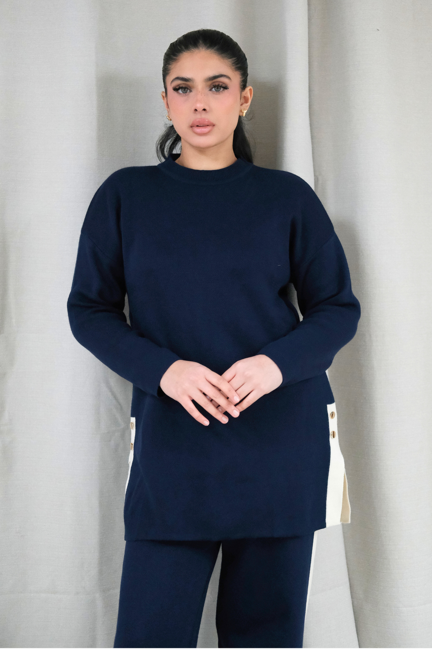 Designed for effortless everyday elegance, the Mable Knit Co-Ord features a relaxed knit top paired with matching straight-cut trousers. Clean lines meet subtle contrast detailing, finished with side button accents that add a refined, modern touch.