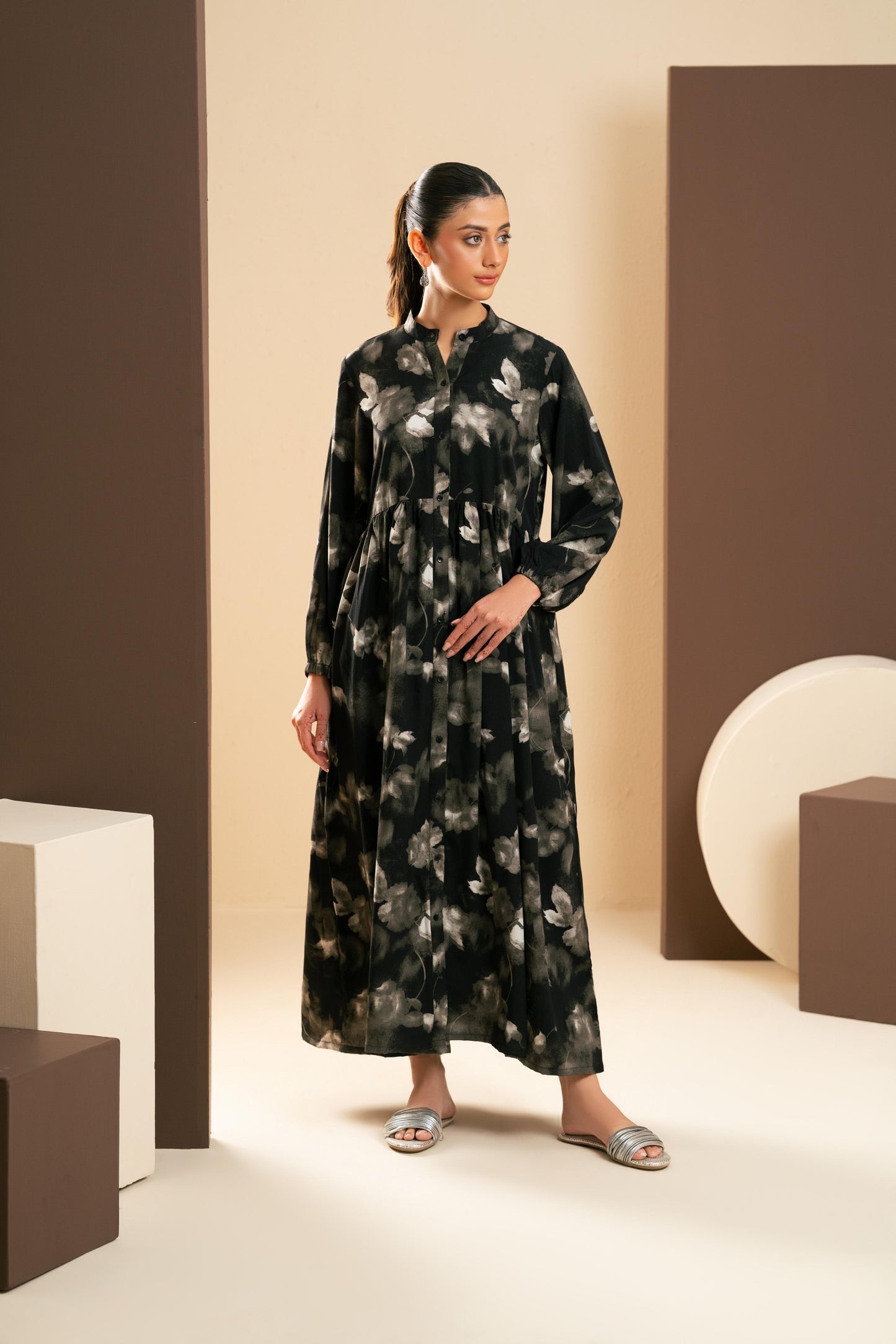 Its full-length silhouette flows naturally with every step, while the gathered waistline and button-down bodice add gentle structure without compromising comfort. The blurred monochrome florals create an elevated, dreamy effect—perfect for daytime elegance, weekend outings, or serene evening moments.