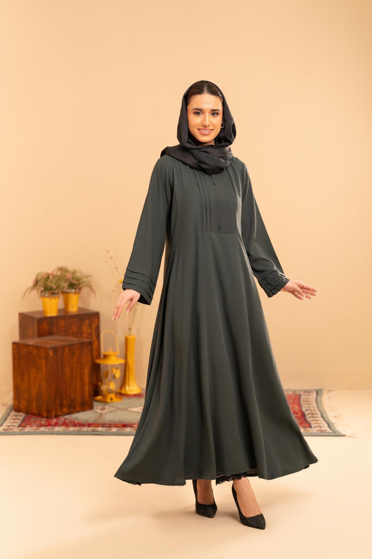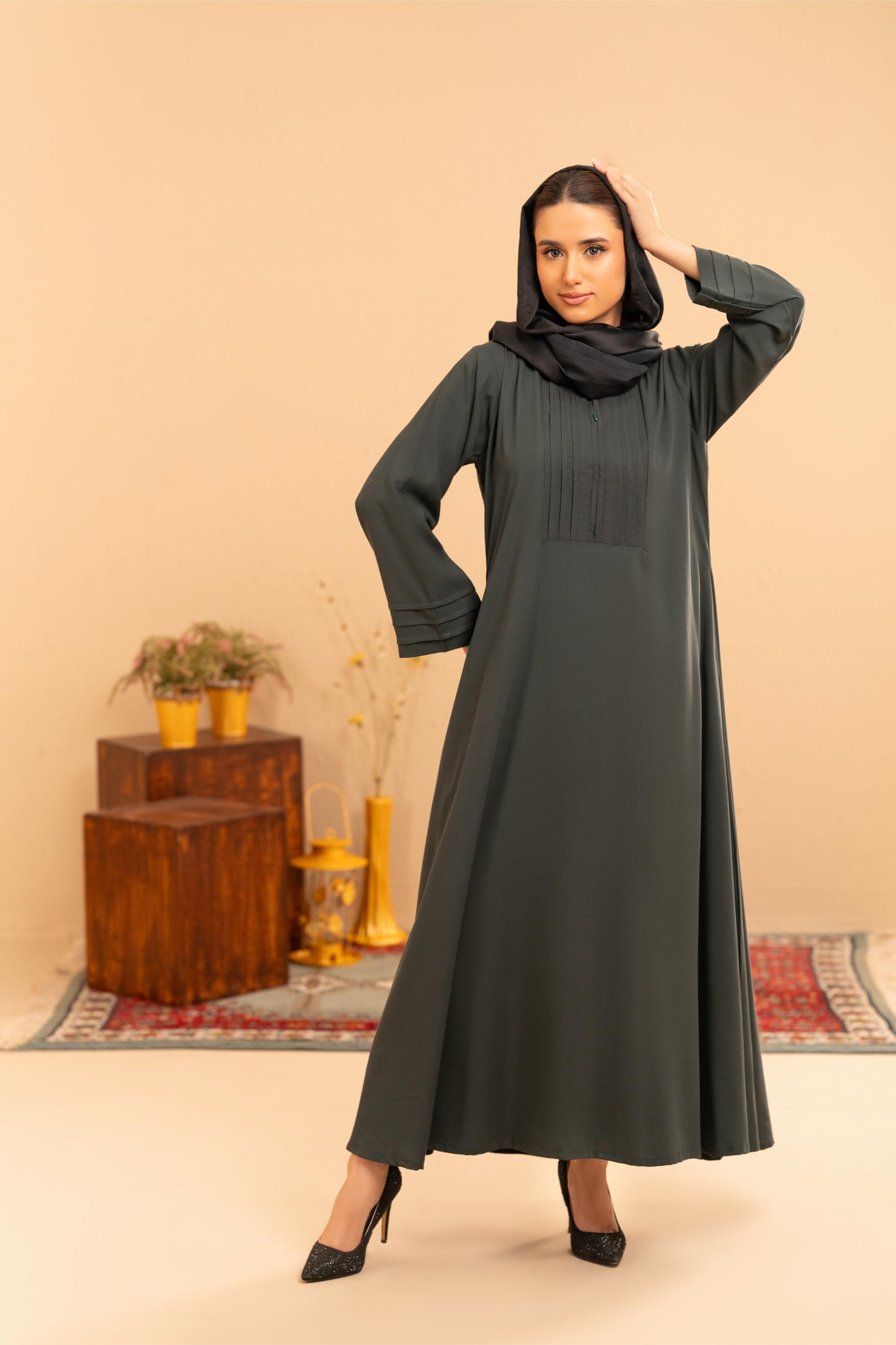 Crafted from soft, breathable viscose in a deep bottle green mareena tone, the Haniya Mareena Midi Dress embodies a sense of calm and grace—perfectly suited for the reflective moments of Ramadan. Designed with a clean, modest silhouette, it features subtle front pleat detailing that adds quiet structure, complemented by a soft band neckline for a polished yet effortless finish.