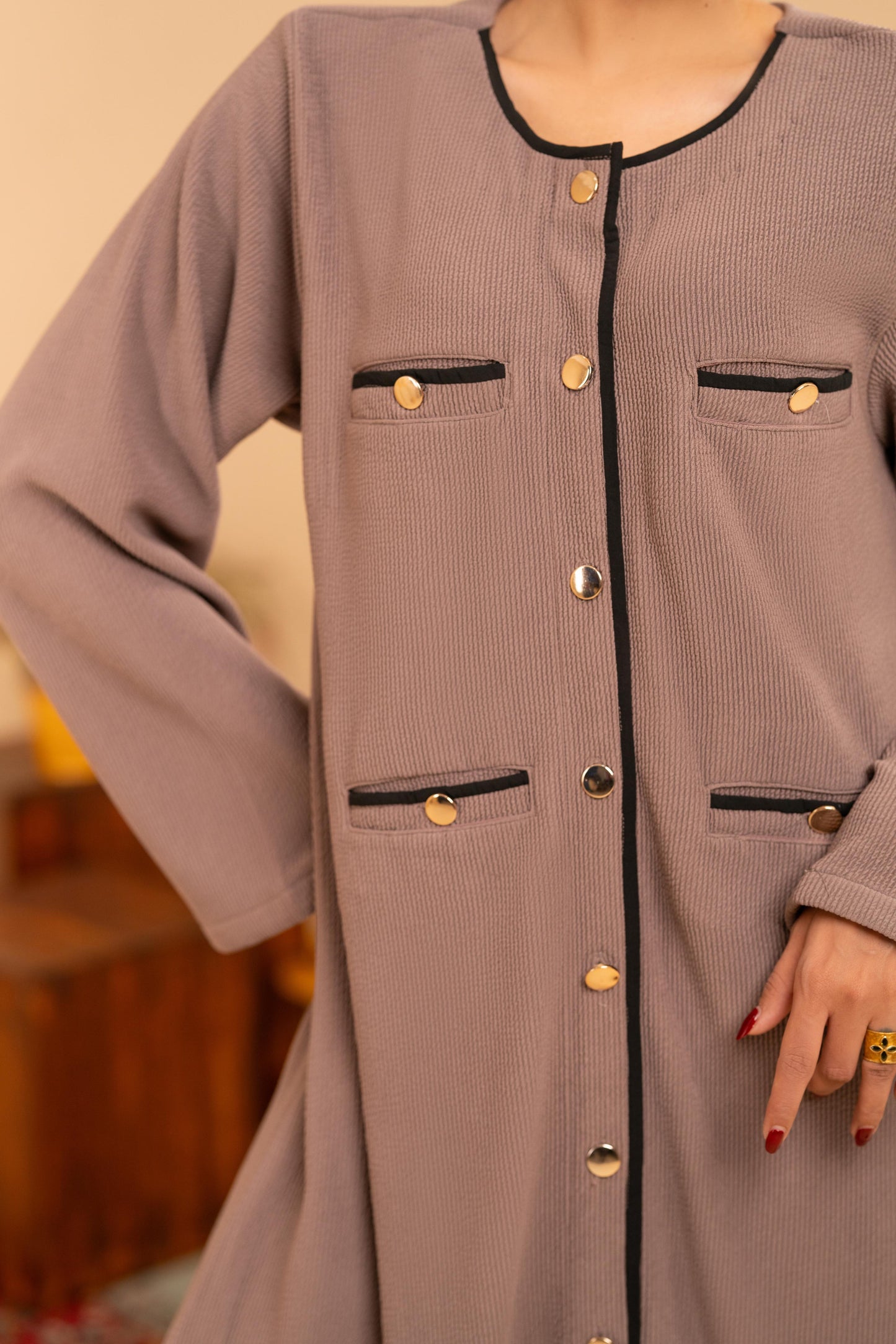 • Design: Gold-tone button detailing with contrast trim