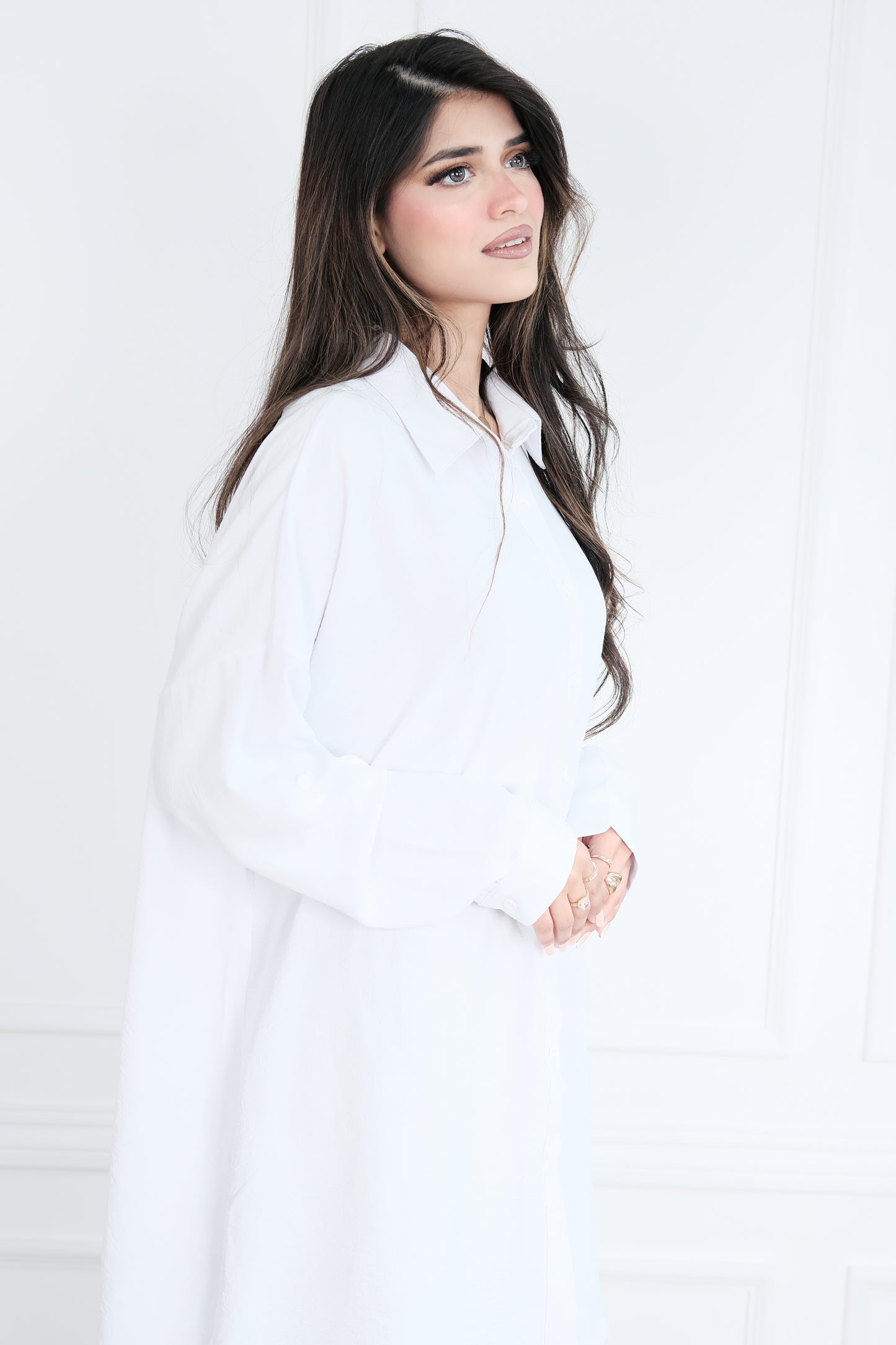 Crafted from soft, breathable crinkle fabric, this longline shirt features a button-down front, roll-tab sleeves, and a flattering oversized fit. Wear it open over a tank and trousers, or buttoned up with jeans for that modest-meets-modern look.
