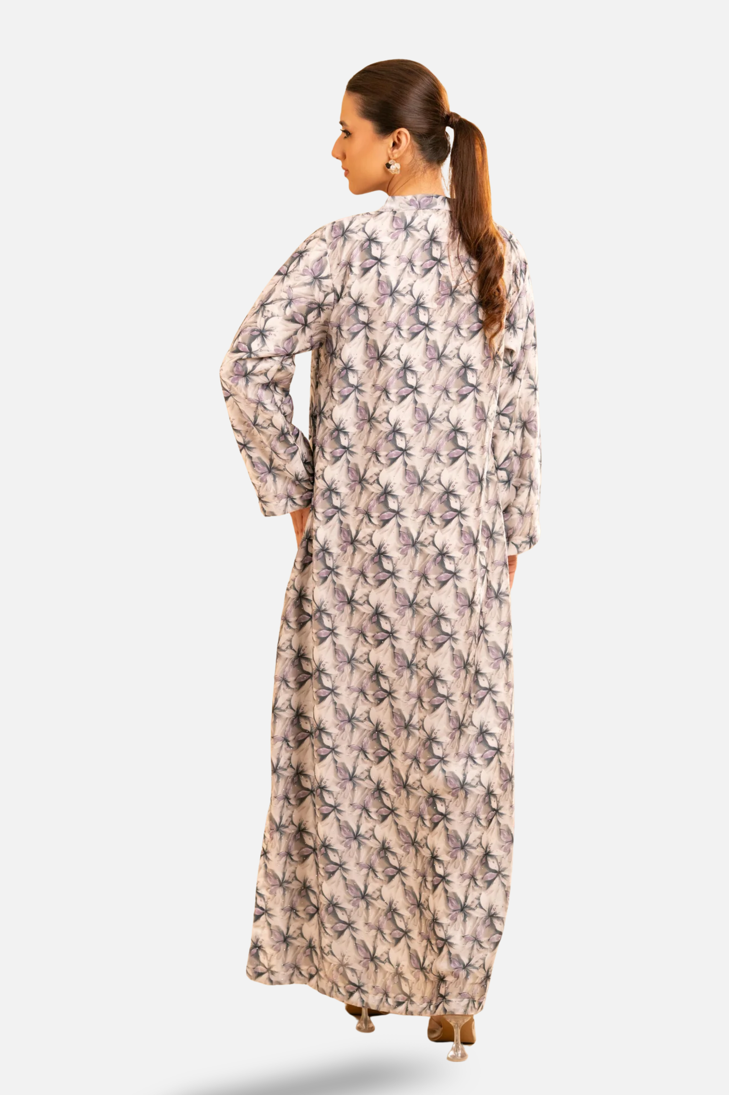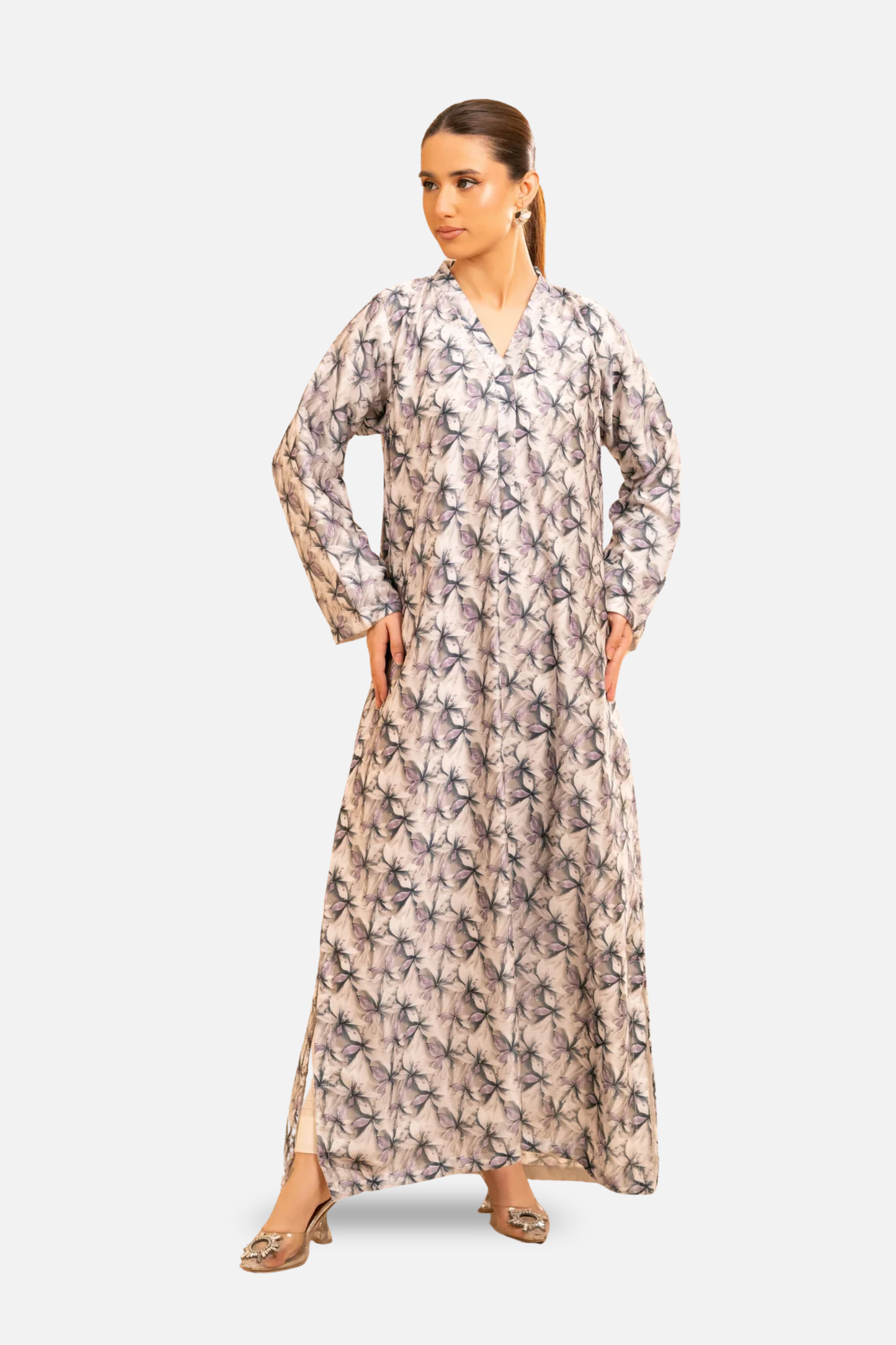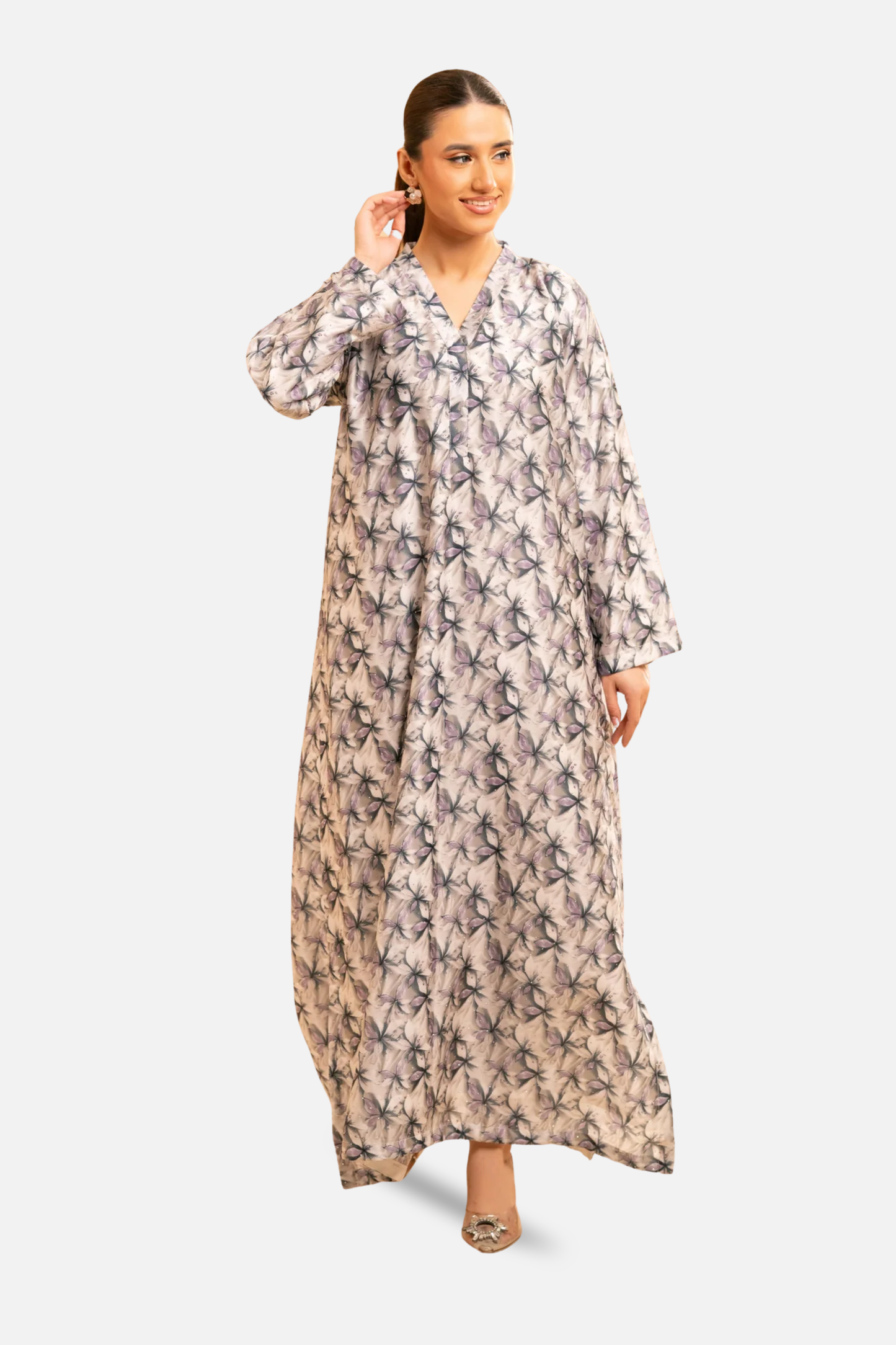 Crafted from smooth satin with a delicate floral print, the Petaline Kaftan brings effortless elegance to everyday dressing. Designed in a relaxed 53” silhouette, this piece features a soft V neckline and fluid drape that moves beautifully with every step.