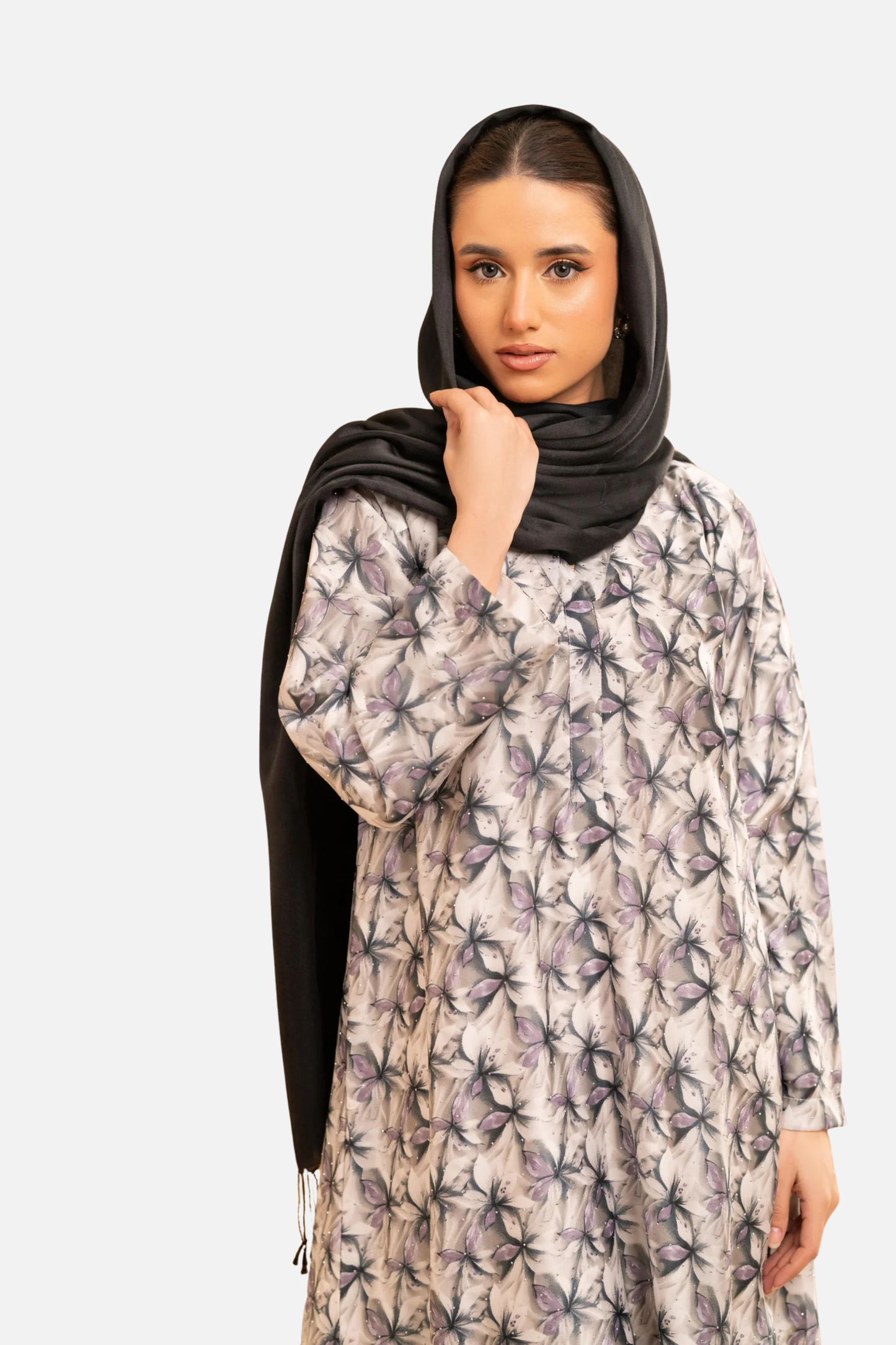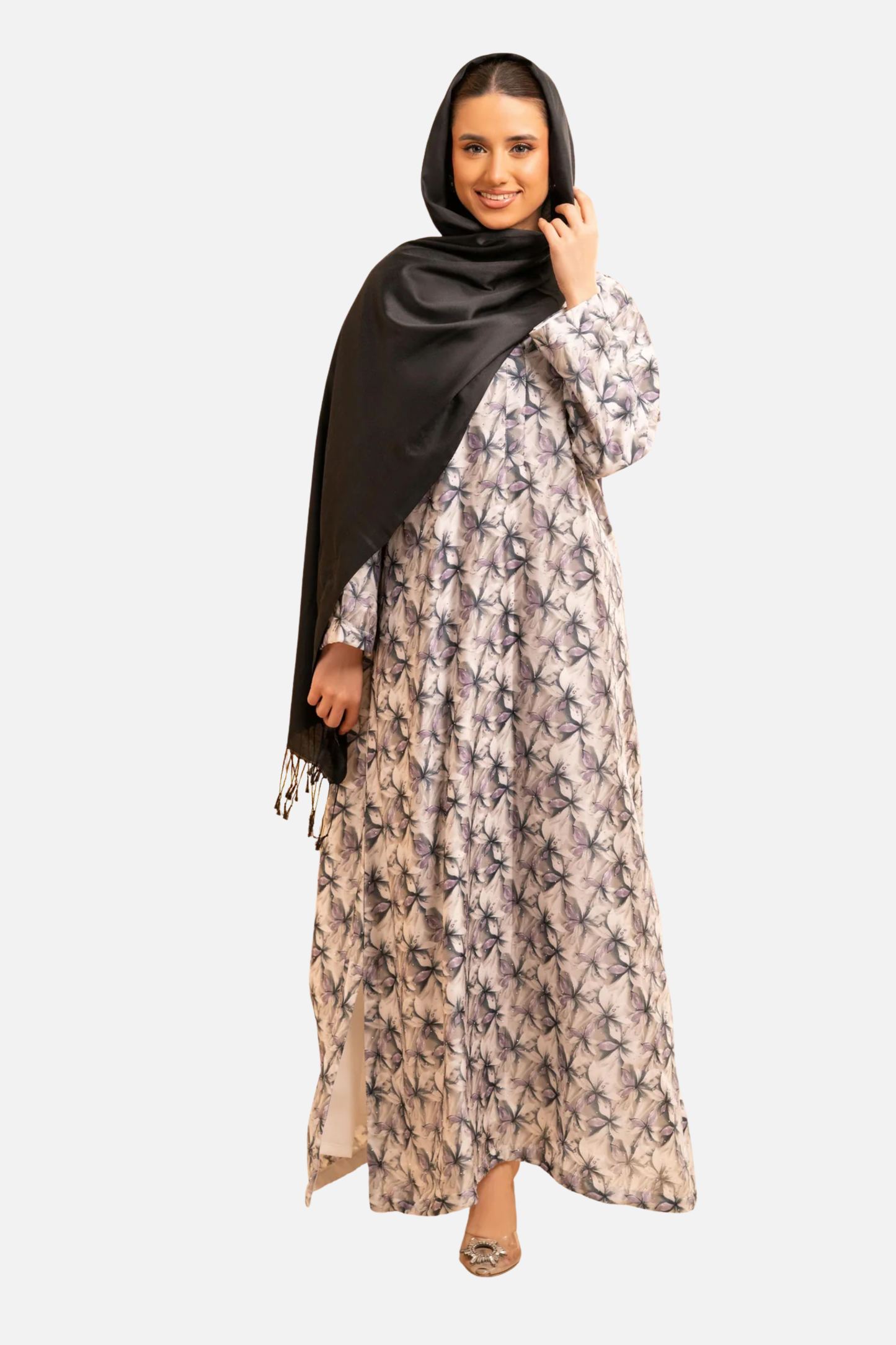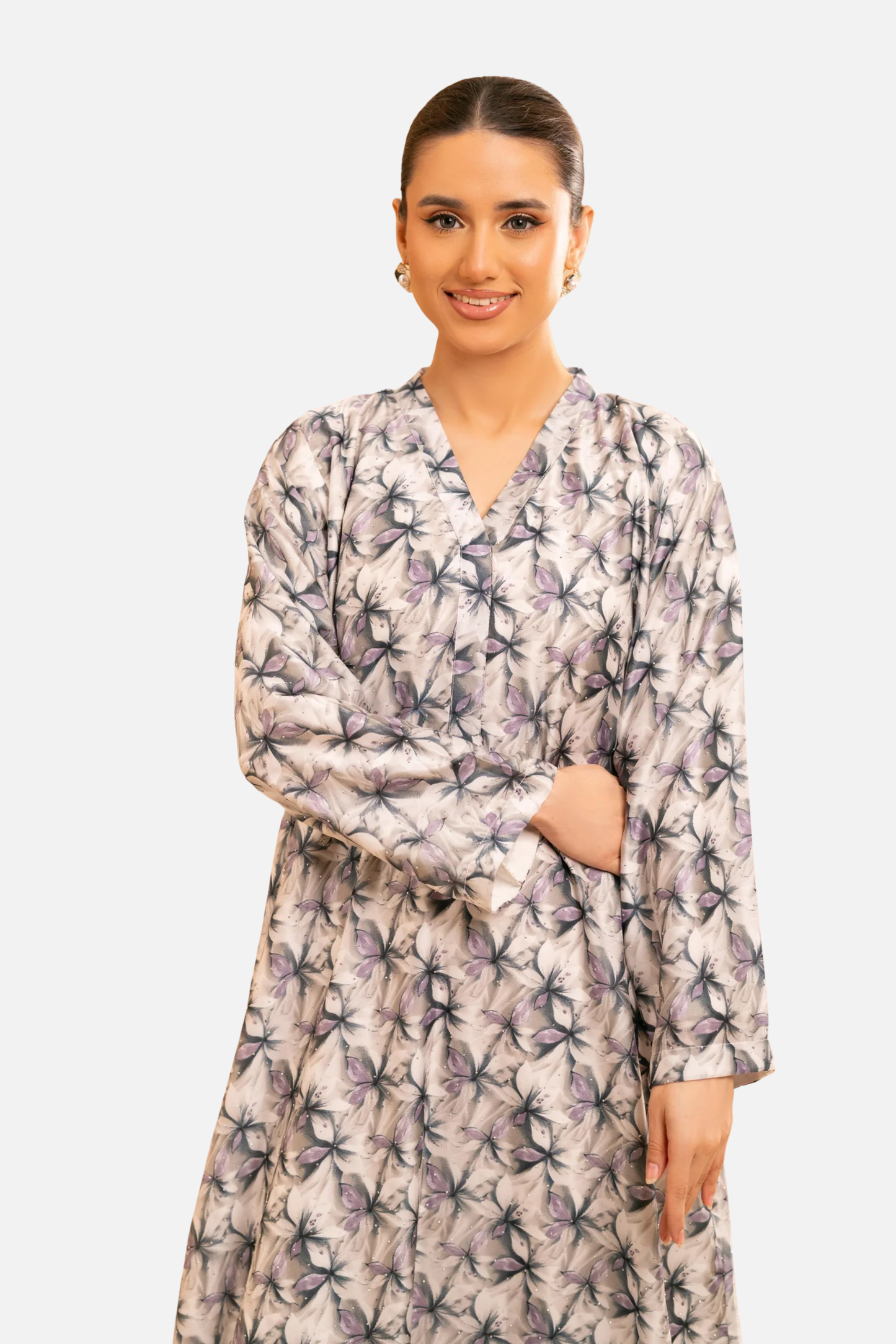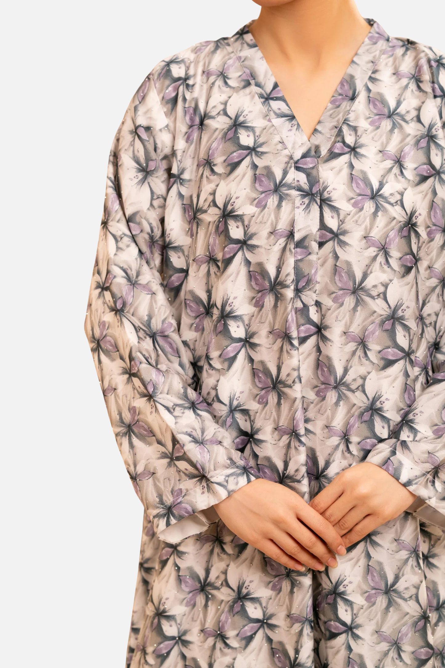 Crafted from smooth satin with a delicate floral print, the Petaline Kaftan brings effortless elegance to everyday dressing. Designed in a relaxed 53” silhouette, this piece features a soft V neckline and fluid drape that moves beautifully with every step.