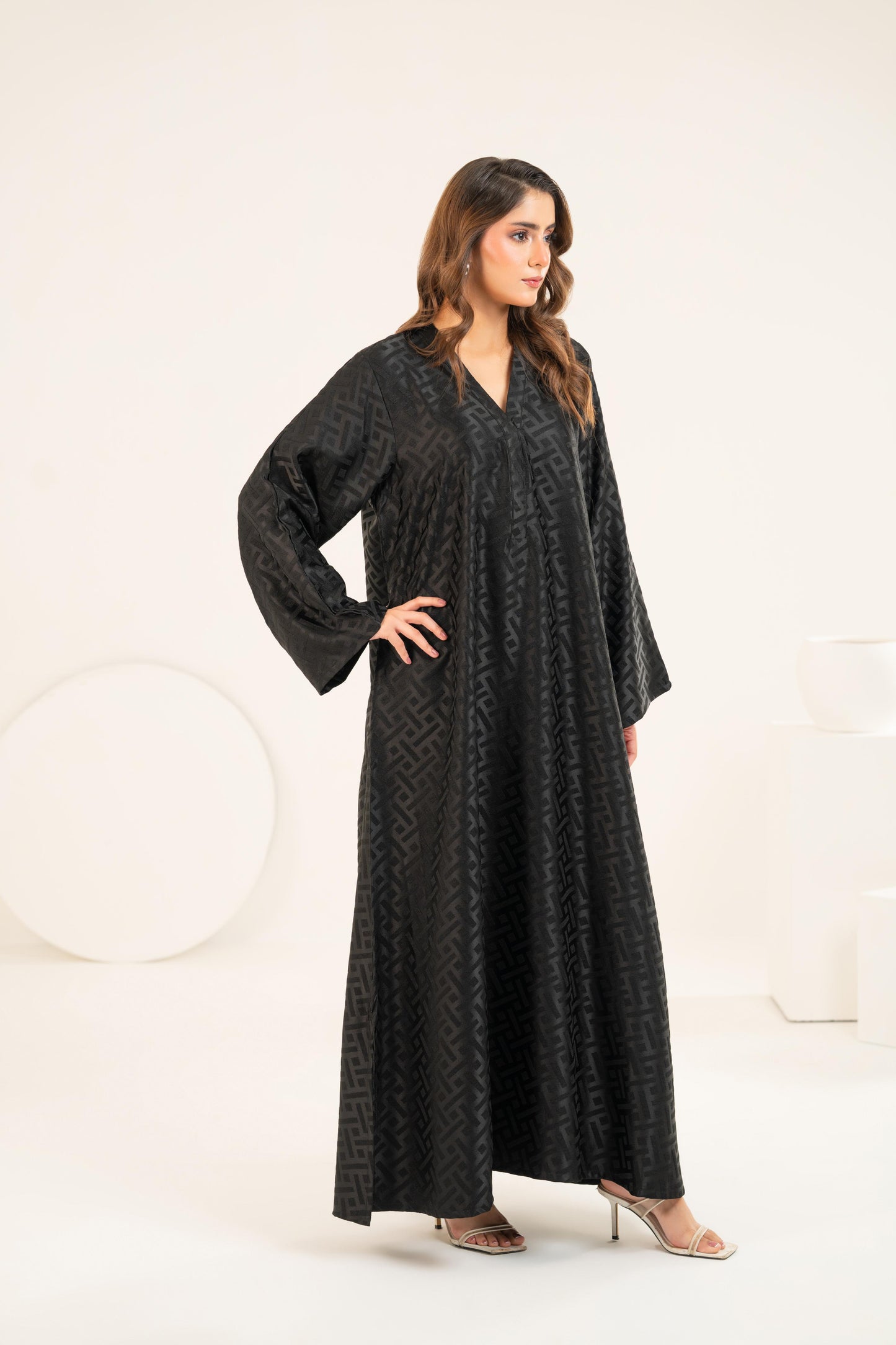 The tone enhances the dimensional texture, while the elegant V-neckline and wide, draped sleeves create a statement shape that feels both powerful and refined. With its fluid structure and soft sheen, this kaftan is perfect for elevated evenings, Eid hosting, and timeless occasion wear.