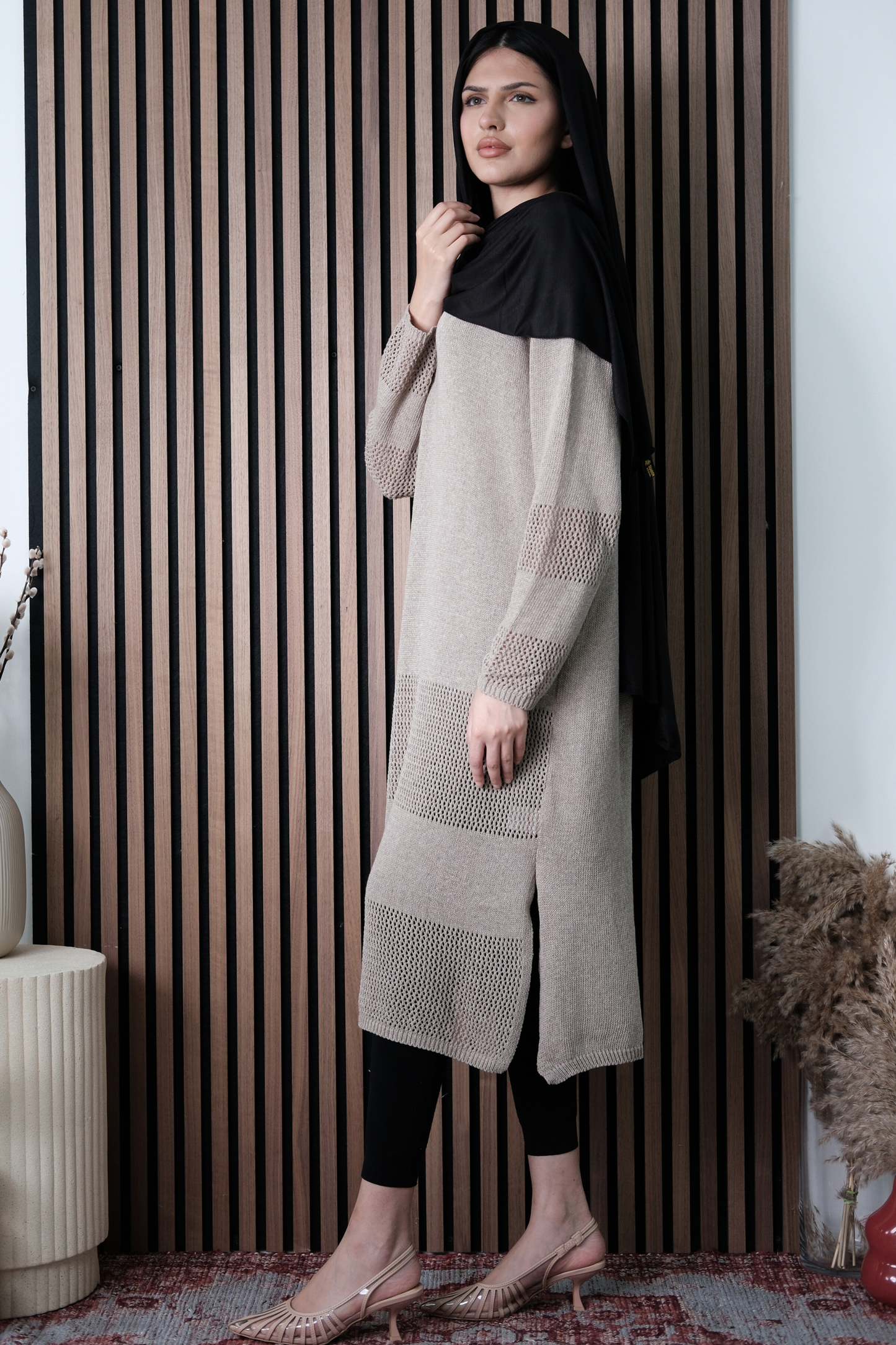 Crafted from a breathable cotton-acrylic blend, this relaxed-fit knit dress features ribbed detailing paired with mesh-textured panels at the sleeves and hem, offering visual depth without compromising on softness.
