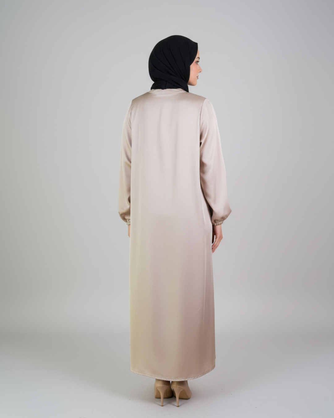 A long luxurious satin dress with cuffed sleeves. Details include side slits and gathers on the neckline.