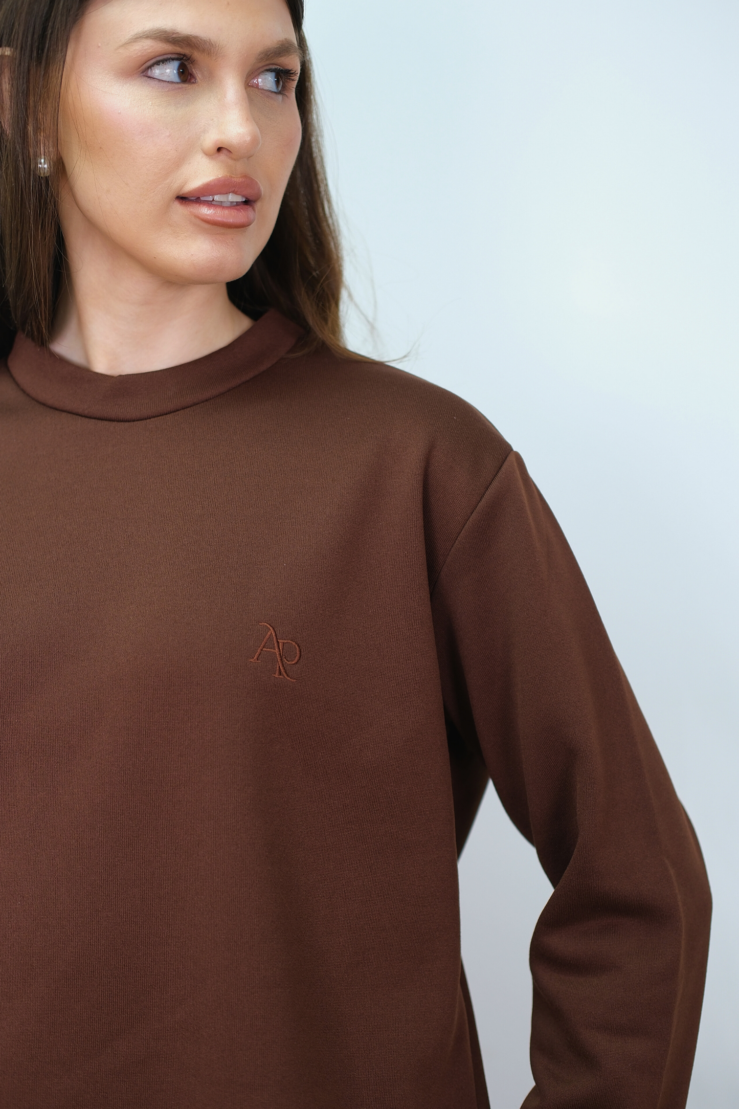 Relaxed co-ord set crafted from a smooth stretch blend. Designed with a clean high neckline and wide sleeves for a modern, modest silhouette. Finished with an exclusive tonal AP embroidered logo on the chest. Paired with wide-leg trousers for effortless structure and comfort.