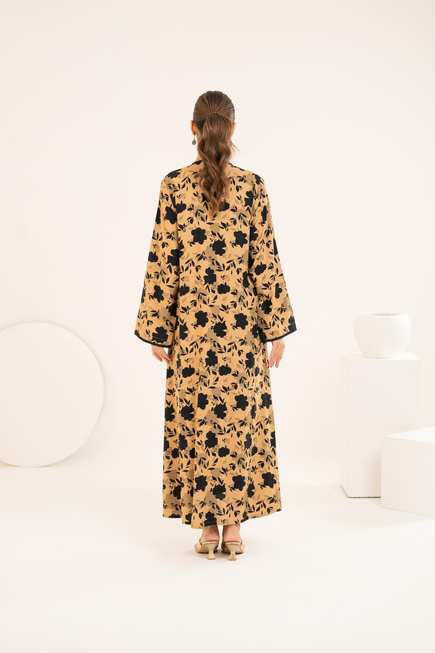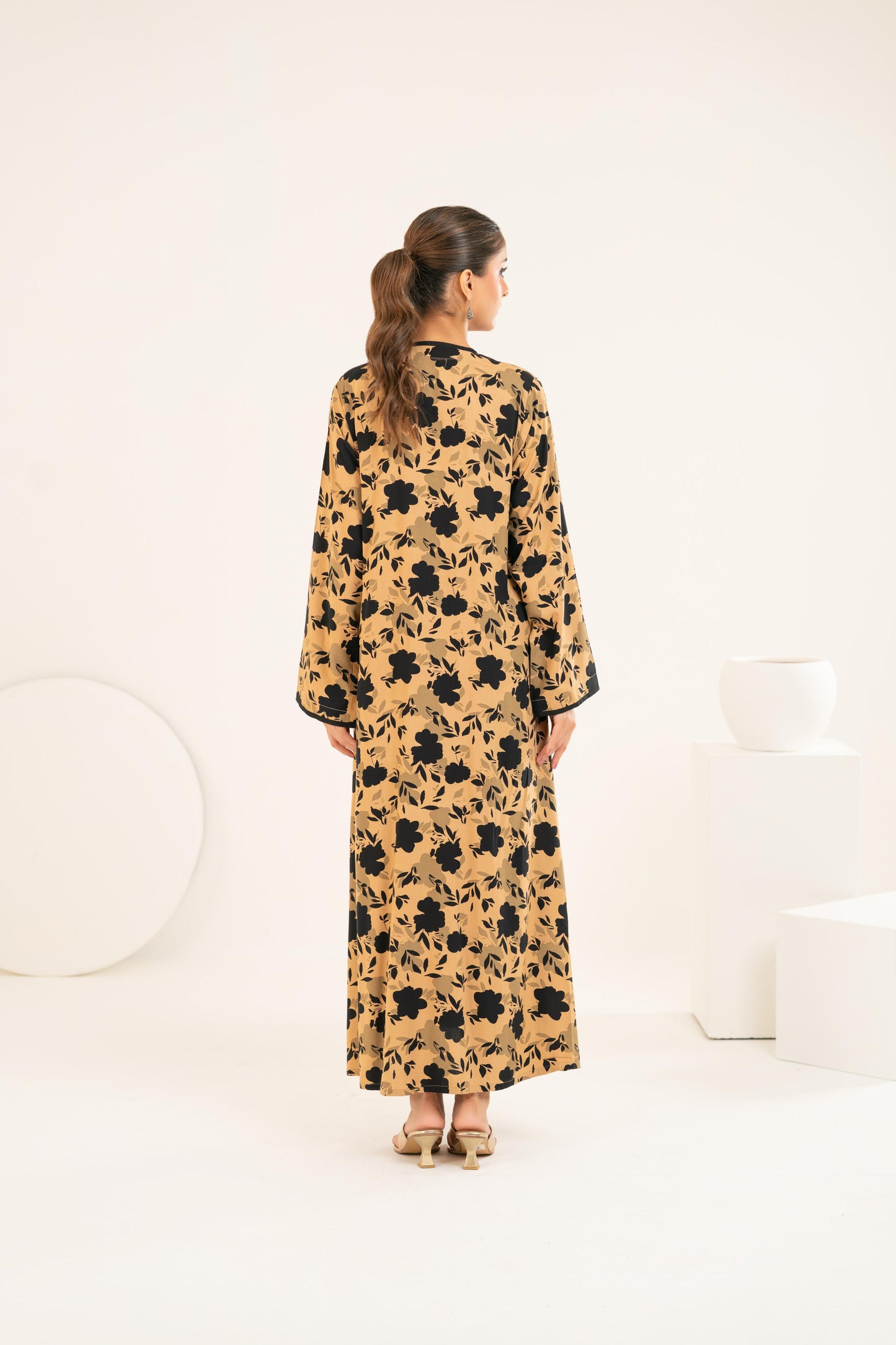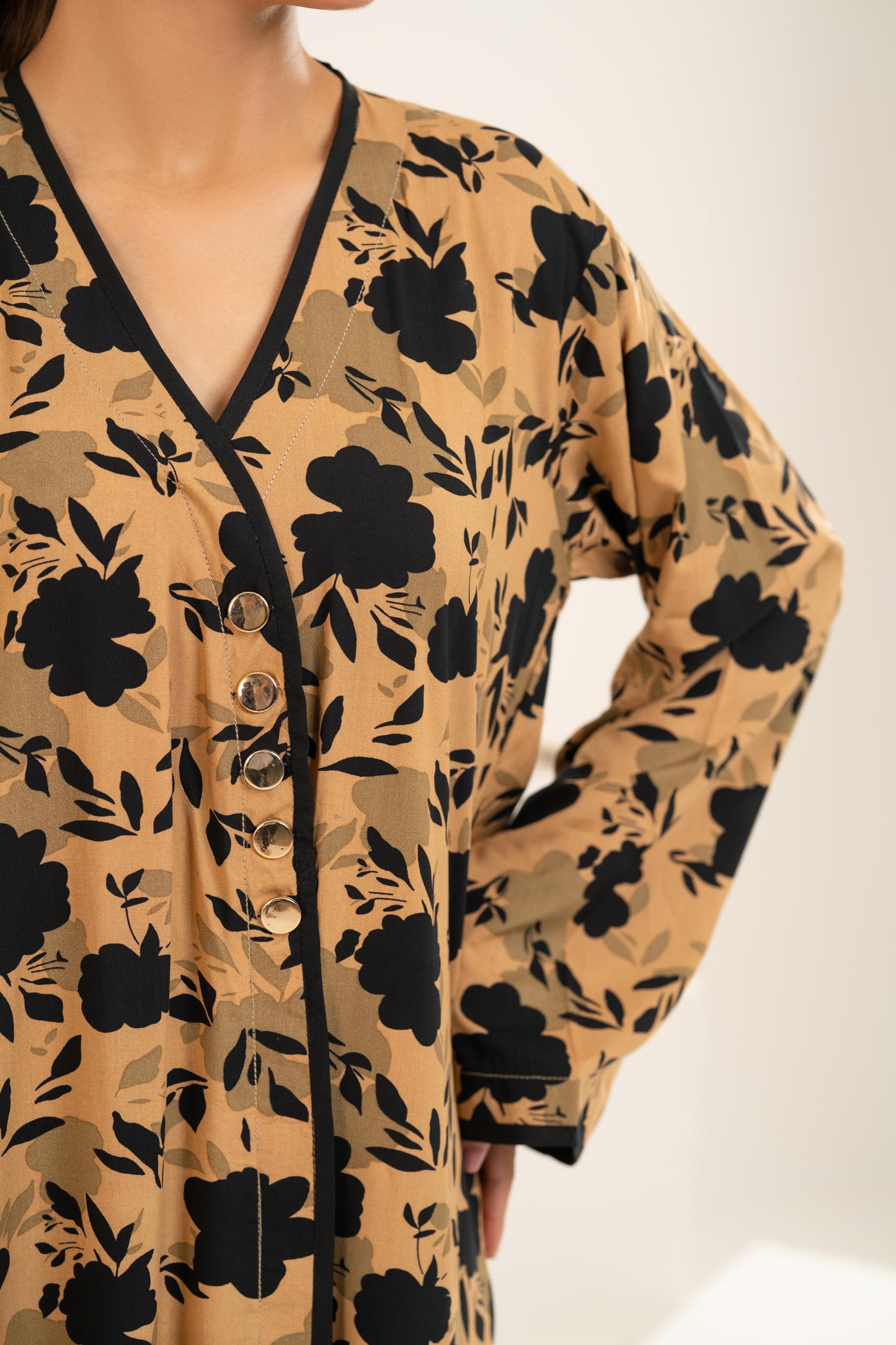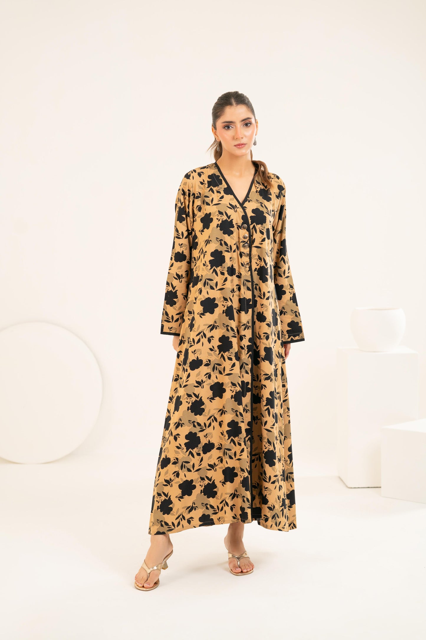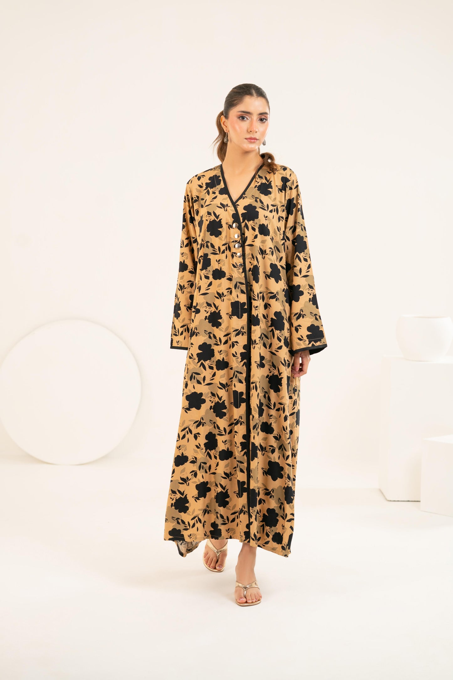 Set against a rich sand-toned base, the bold black floral print creates a striking yet timeless contrast. The elegant V-neckline with delicate black trim and statement front buttons adds a touch of structure, while the relaxed cut allows graceful movement with every step. Perfect for Ramadan evenings, Eid brunches, or elevated everyday wear.
