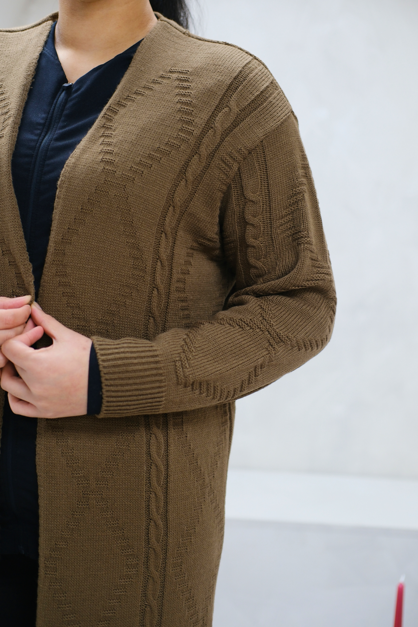 This thick knit cardigan is perfect for the Autumn season. Ideal for the colder days. Details include visible diamond knit design, and full-length cuffed sleeves.